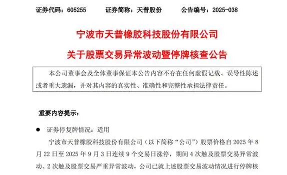 天普股份9月10日晚公告称,公司股票自8月22日至9月10日连续涨停,累计上涨185.29%,严重偏离基本面。公司就近期股票交易波动情况进行停牌核查,将于9月11日开市起停牌,待披露核查公告后复牌。